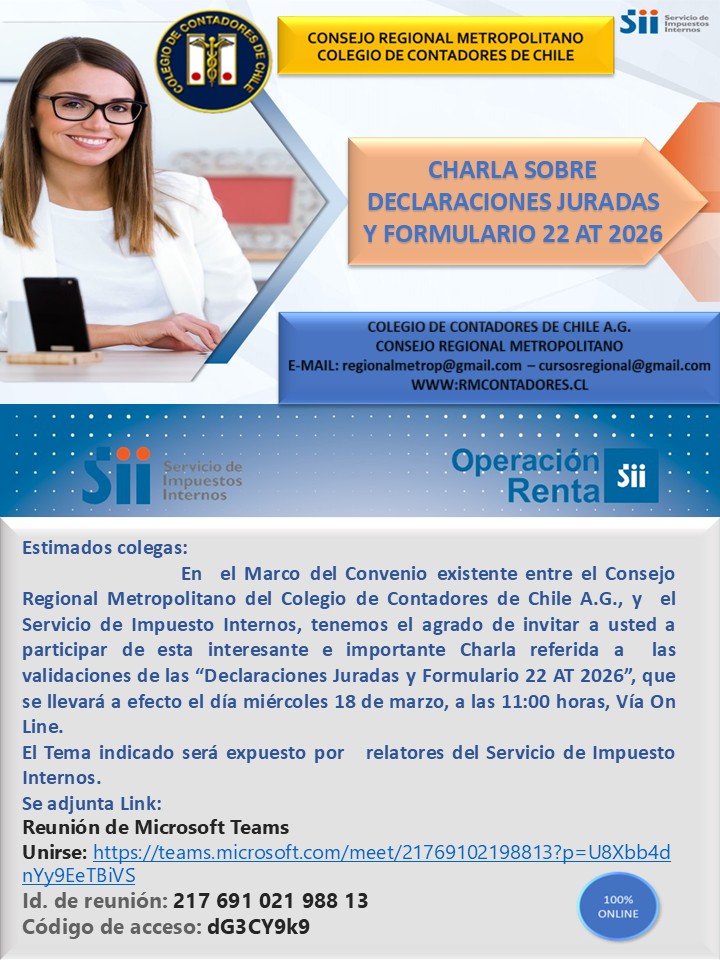 Comunicado: Material de Capacitación Operación Renta 2026 Estimados colegiados: Compartimos la presentación del Servicio de Impuestos Internos (SII) utilizada en la capacitación del pasado 19 de febrero en Duoc UC. Este material detalla los procesos y validaciones de las Declaraciones Juradas y Renta 2026. Les instamos a revisar y contrastar la información del SII con sus registros contables […]