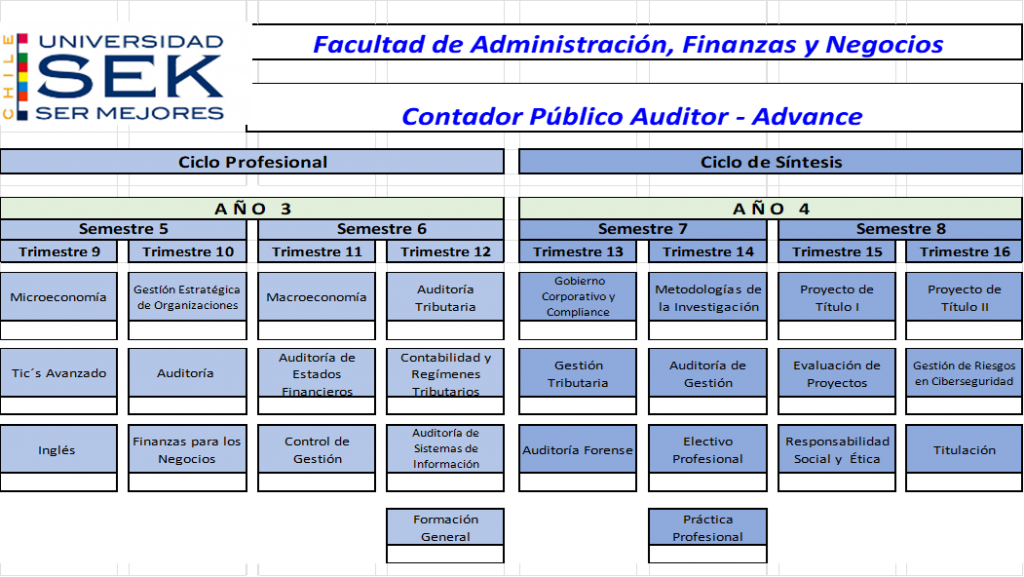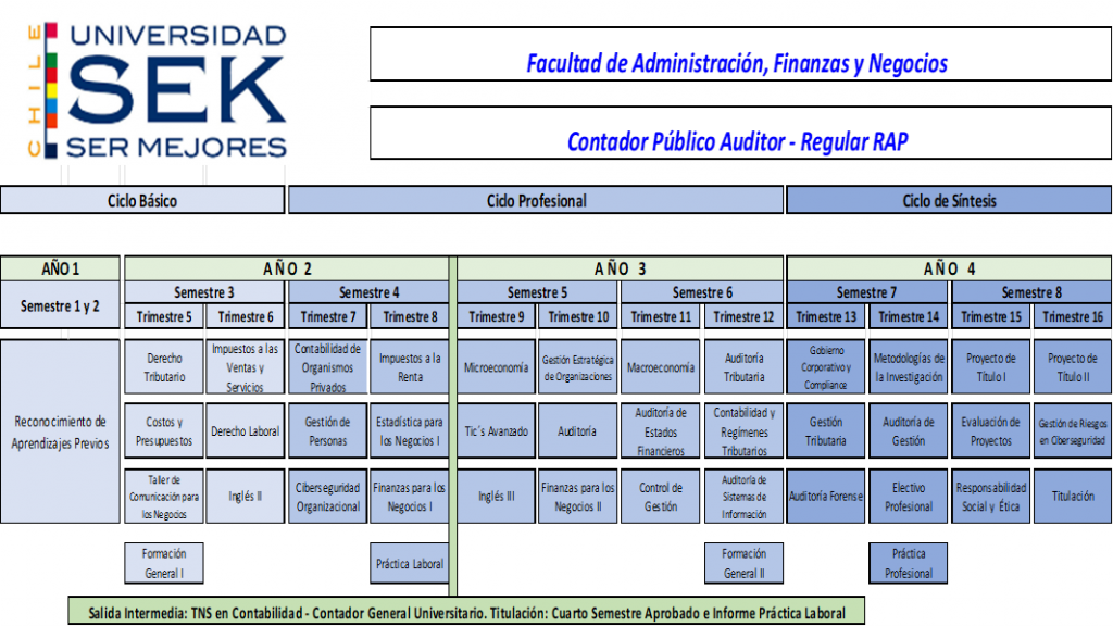 Los programas son impartidos por la Universidad SEK, a través de su Facultad de Administración, Finanzas y Negocios, y se desarrollan bajo las modalidades de Pregrado Regular, Reconocimiento de Aprendizajes Previos (RAP) y Continuidad de Estudios modalidad Advance, conforme a la oferta académica vigente y a la normativa institucional de la Universidad.