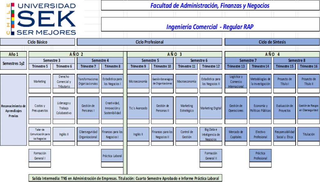 Quienes finalicen el Programa Regular o Regular RAP de Ingeniería Comercial, podrán continuar estudios en el Programa Advance de Contador Público Auditor, cursando un programa especial de continuidad de un año adicional, conforme a malla y condiciones vigentes.